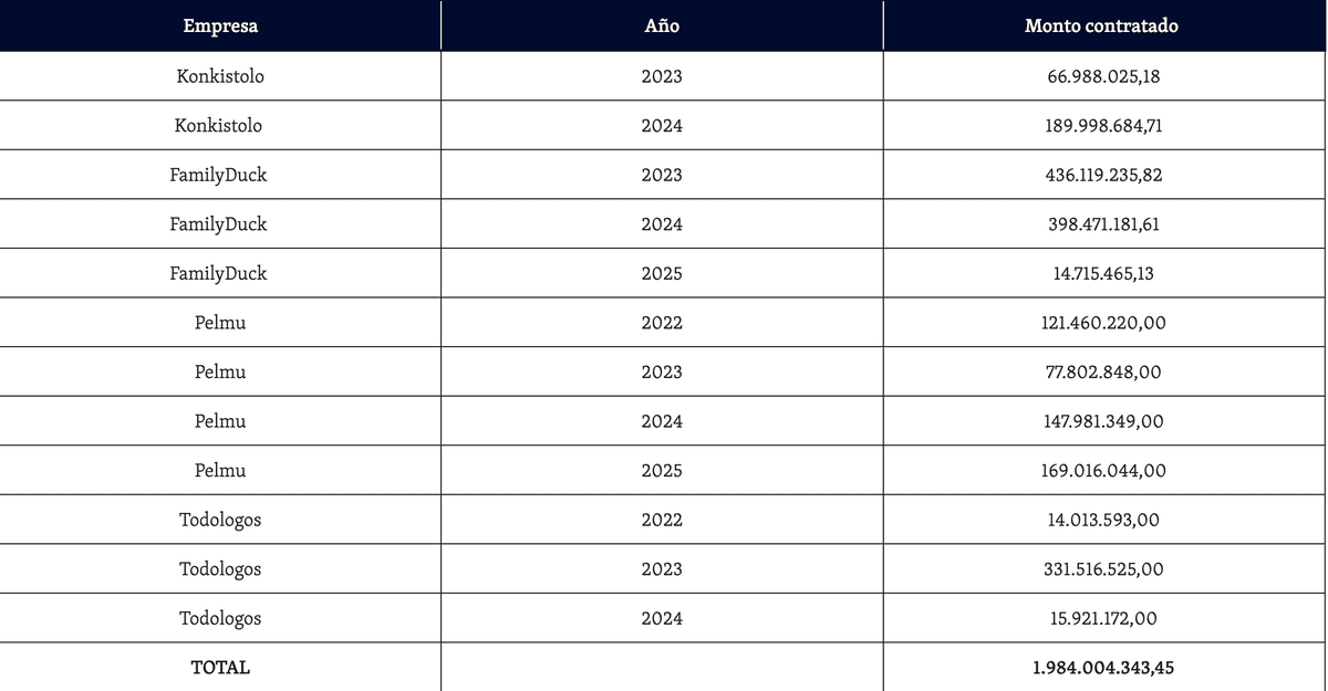 El reparto de contratos a esta red inició en 2022, con 135 millones de pesos para Todólogos.com; su punto más alto lo alcanzó en en 2023, con 912 millones de pesos adjudicados en conjunto: FamilyDuck obtuvo ese año 436.1 millones, Todólogos 331.5 millones, Pelmu 77.8 millones y Konkistolo 66.9 millones.