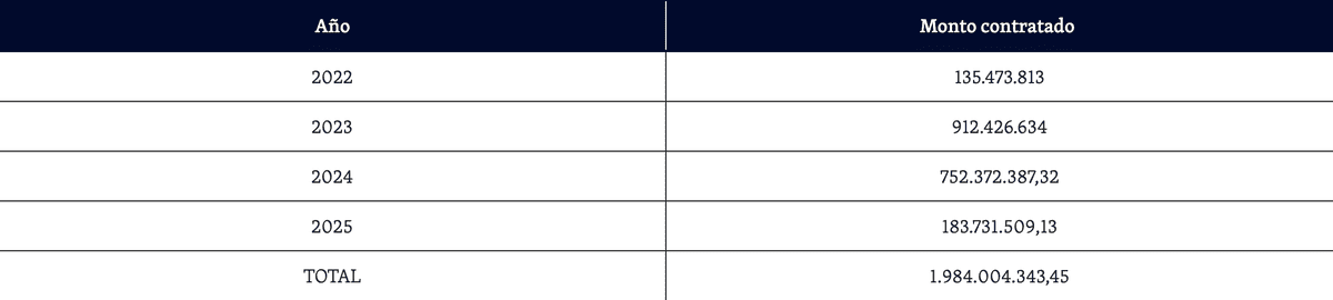 Aunque en 2025 los contratos descendieron a 183.7 millones de pesos, la suma global del periodo -1,984 millones de pesos- exhibe con crudeza la magnitud de los contratos irregulares.