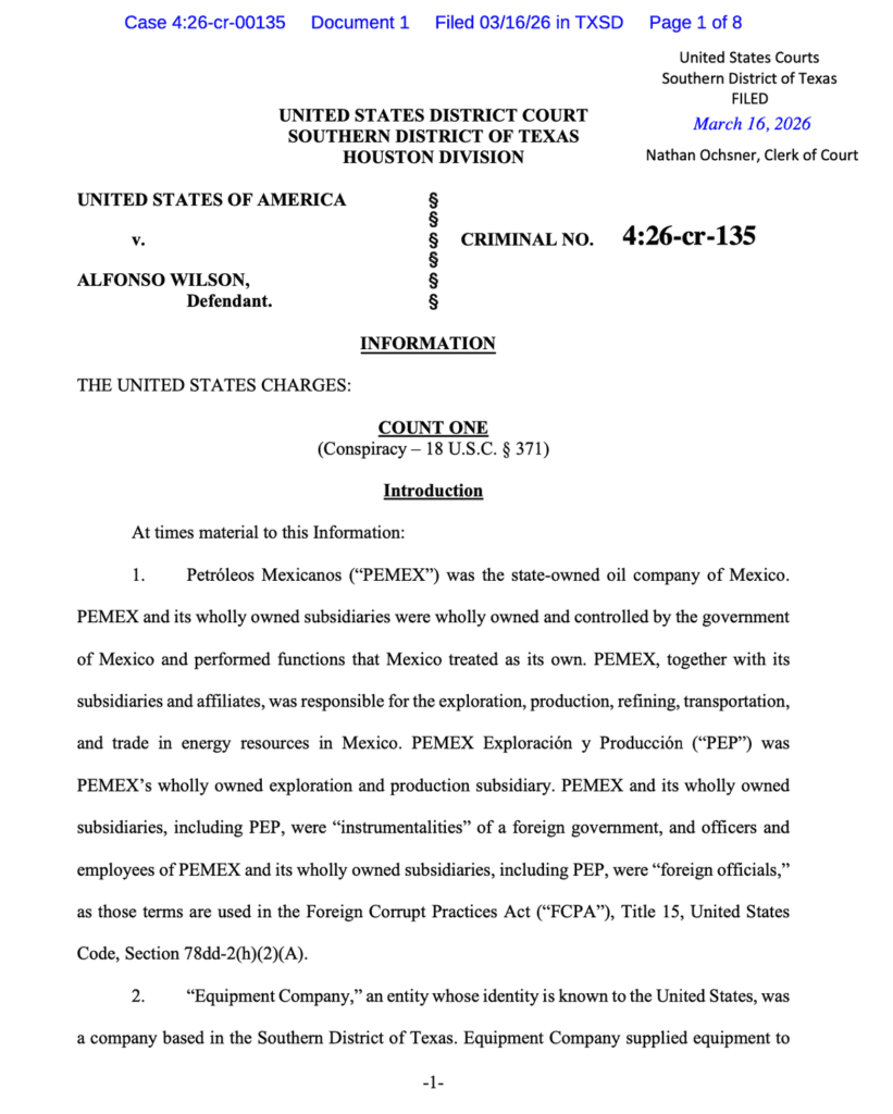 Aunque los documentos judiciales del caso no revelan el nombre de la empresa que recibió la asignación de 540 millones de dólares, el sitio www.fcpaprofessor.com, especializado en dar seguimiento a casos de corrupción en Estados Unidos, mencionó desde el pasado 18 de marzo de 2026 a la empresa texana Drillmec como la supuesta beneficiada con el contrato que fue negociado con la intermediación de Wilson.
