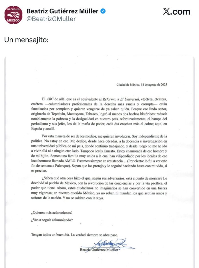 La reciente carta de Beatriz Gutiérrez Müller, esposa del expresidente Andrés Manuel López Obrador, buscaba desmentir las versiones sobre su supuesta solicitud de nacionalidad española y su traslado a Madrid. Sin embargo, lejos de aclarar las especulaciones, el texto ha avivado el debate sobre su coherencia ideológica y ha revelado una mentalidad preocupante dentro del círculo cercano a la autodenominada Cuarta Transformación (4T). Este episodio no solo expone contradicciones personales, sino que también sugiere una actitud de superioridad y revanchismo político que merece un análisis profundo.