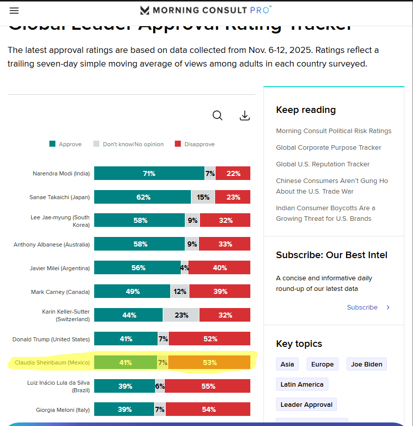 ¡Párenle a la música! En su más reciente aparición, la misma Claudia ya no se atreve a mencionar esos sondeos que la tenían en la cima, porque ¿saben qué? ¡Puf! La última encuesta de Morning Consulting la arroja de lleno en la novena posición, con un 41% de aprobación y un escandaloso 53% de desaprobación. No es que tenga queudarse a que pase algo, pero eso es menos que salirse del semestre con un 7.0. ¡Vamos, Claudia! Así no es cómo se hacen las cosas.