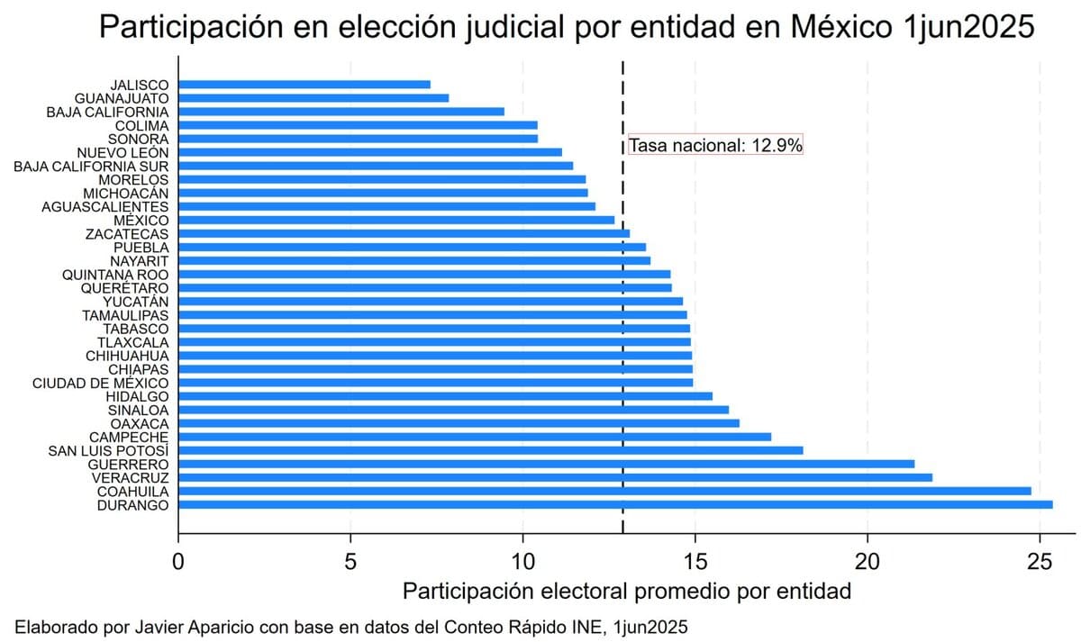 La asistencia promedio para la elección judicial en el país fue del 12.9%, con entidades como Jalisco, Guanajuato o Baja California por debajo del 10%. En contraste, debido a la concurrencia de comicios locales para renovar ayuntamientos, Durango y Veracruz tuvieron una mayor afluencia a las urnas, alcanzando el 25%, porcentaje al que se sumó Coahuila.