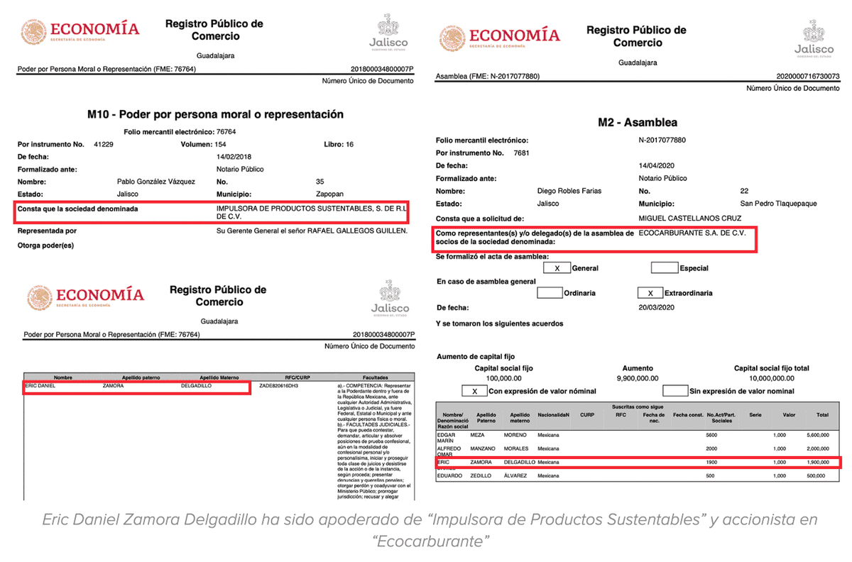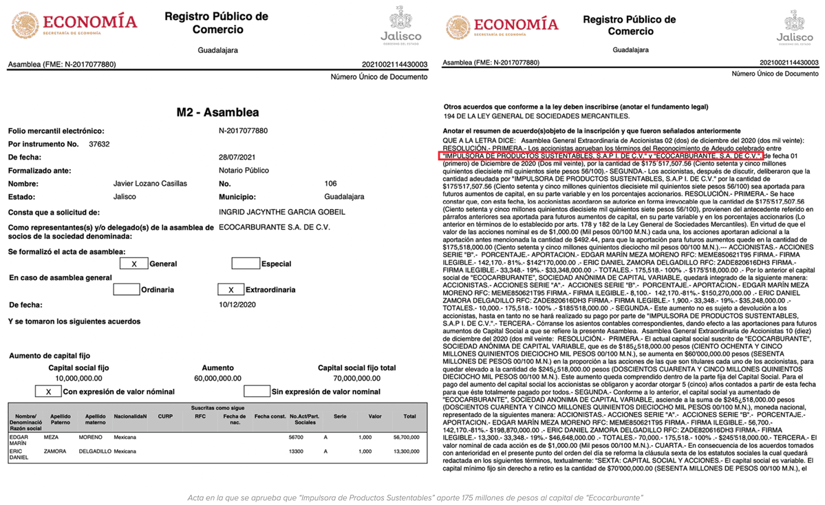 Con ese acuerdo, las acciones de “Ecocarburante” quedaron concentradas en dos socios: Edgar Marín Meza Moreno (quien era copropietario de “Impulsora de Productos Sustentables”), con una aportación mayoritaria de 142 millones de pesos, equivalente al 81% de las acciones, mientras que Eric Daniel Zamora Delgadillo se quedó con 33 millones de pesos, que representa el 19% de las acciones.