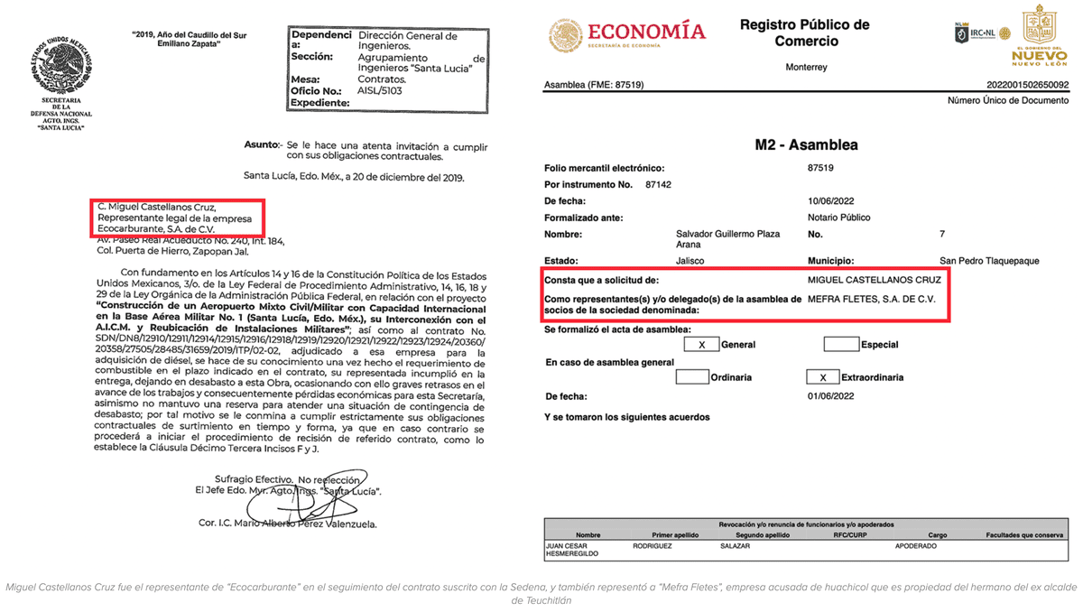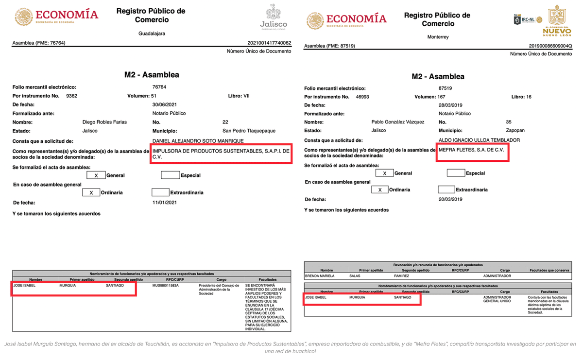 Mexicanos contra la Corrupción y la Impunidad (MCCI) obtuvo contratos, facturas, órdenes de pago y actas mercantiles que muestran los vínculos de negocios entre “Ecocarburante”, “Impulsora de Productos Sustentables” y “Mefra Fletes”.