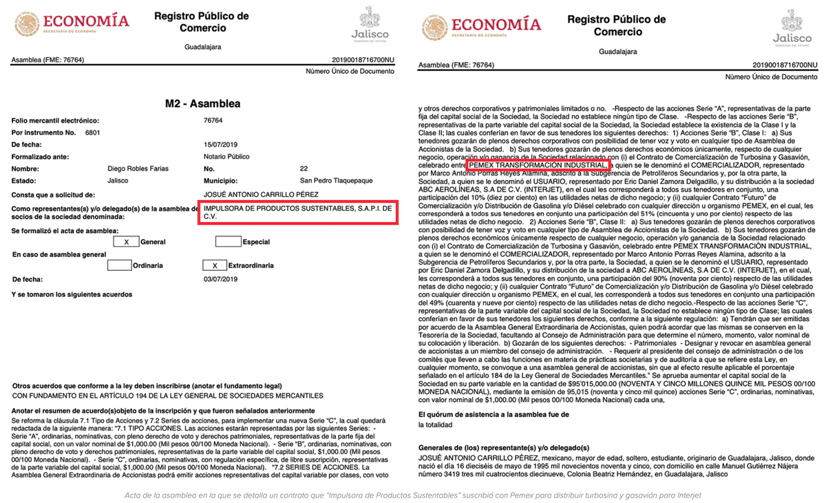 En el acta se anotó que la empresa había suscrito un contrato con Pemex Transformación Industrial, representada por Marco Antonio Porras Reyes Alamina, adscrito a la Subgerencia de Petrolíferos Secundarios para triangular la entrega del combustible a la aerolínea.