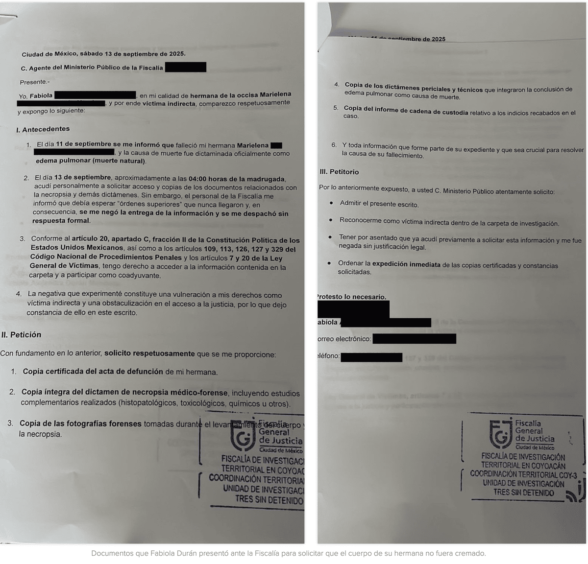 Desde el 13 de septiembre, los familiares de Marielena solicitaron a la Fiscalía de Investigación Territorial en Coyoacán que garantizara la custodia, conservación y resguardo del cuerpo en instalaciones adecuadas y bajo la responsabilidad de la autoridad ministerial.