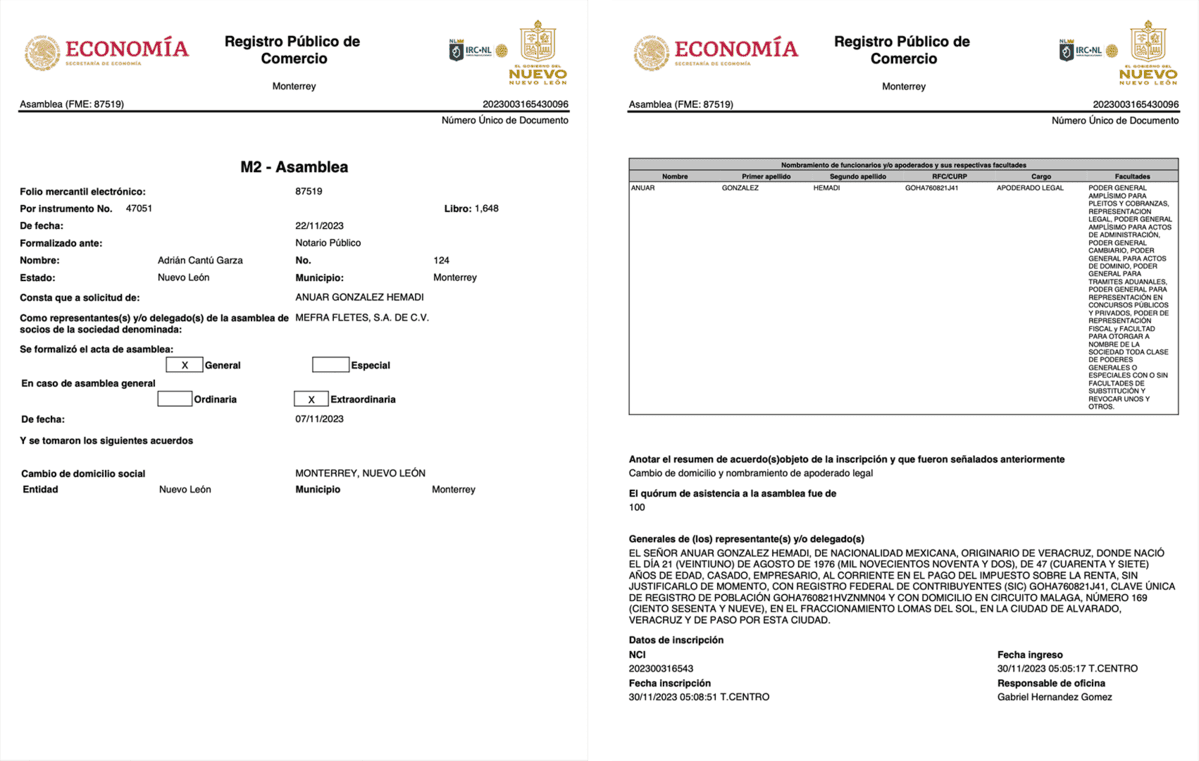 El ahora detenido, fue designado como apoderado de la compañía fletera en noviembre de 2023, según consta en actas del Registro Público de Comercio consultadas por MCCI.