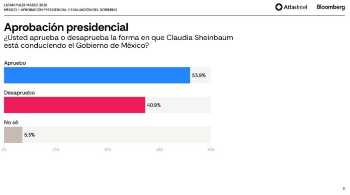 Las encuestas sobre la aprobación de la presidenta Claudia Sheinbaum revelan una brecha cada vez más marcada entre sondeos nacionales e internacionales. Mientras empresas mexicanas reportan niveles de respaldo entre 70 y 80 por ciento —con picos de 79.5 por ciento en evaluaciones de “bueno o muy bueno” según FactoMétrica y Reporte Índigo en marzo de 2026—, consultoras extranjeras como Atlas Intel y Morning Consult muestran una tendencia a la baja que inquieta. Atlas Intel registró una aprobación de 53.9 por ciento en marzo, tras una caída de casi nueve puntos desde enero, y la calificación del gobierno como “Excelente/Bueno” se desplomó de 51.3 por ciento en febrero a 39.5 por ciento. Morning Consult, por su parte, ubica el respaldo en torno a 45-46 por ciento, con desaprobación superior al 49 por ciento.