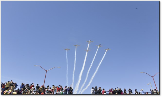 Como parte del programa, 10 aeronaves de la Fuerza Aérea sobrevolaron el espacio aéreo, efectuando pases y maniobras, mostrando con ello un elevado grado de adiestramiento, habilidad y precisión que caracteriza a las y los pilotos que operan estas aeronaves entre las cuales participaron seis aviones T-6C+ “Texanos”, dos aviones F-5 “Tiger II”, un avión Casa C-95 y un helicóptero UH-60.