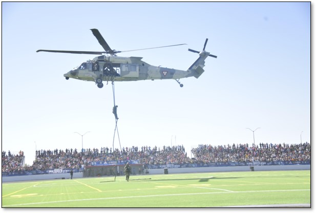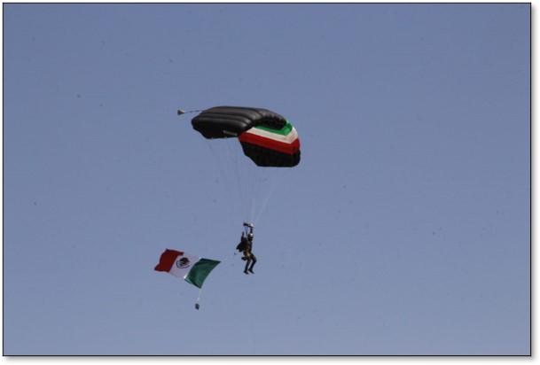 Personal de la Brigada de Fusileros Paracaidistas realizaron saltos de caída libre militar e integrantes del Cuerpo de Fuerzas Especiales desarrollaron una demostración de una operación aérea, la cual consistió en la técnica de maniobra de extracción de personal por medio de un helicóptero.