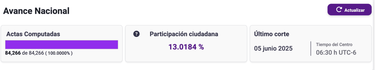 El presente texto fue actualizado debido a que a las 6:30 horas del jueves 5 de junio, se terminó con el computo de las actas de la elección judicial.