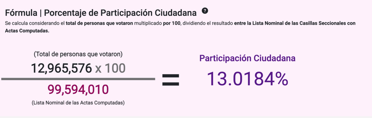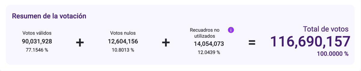 Estas cifras implican que no se alcanzó la meta de 13 millones de votantes. Al descontar los votos nulos y las boletas con recuadros sin utilizar, el dato real de electores que votaron válidamente en la elección judicial se reduce a menos de 10 millones. Esta cantidad dista mucho de las expectativas de los promotores de estos comicios, quienes esperaban una participación de 20 millones de votantes.