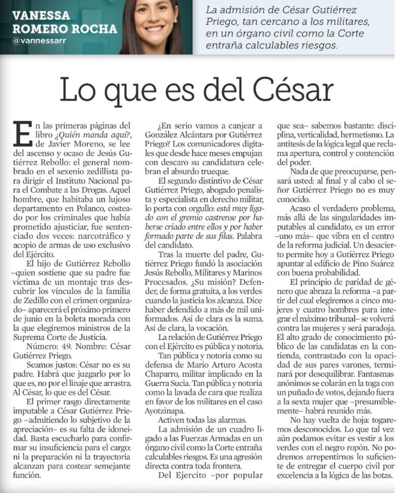 Romero Rocha apunta a que la posibilidad de que César Gutiérrez Priego, hijo del general Jesús Gutiérrez Rebollo, se convierta en representante de los militares: “está muy ligado con el gremio castrense por haberse criado entre ellos y por haber formado parte de sus filas. Palabra del Candidato”, además de advertir: “La admisión de un cuadro ligado a las fuerzas armadas en un órgano civil como la Corte entraña calculables riesgos. Es una agresión directa contra toda frontera”.