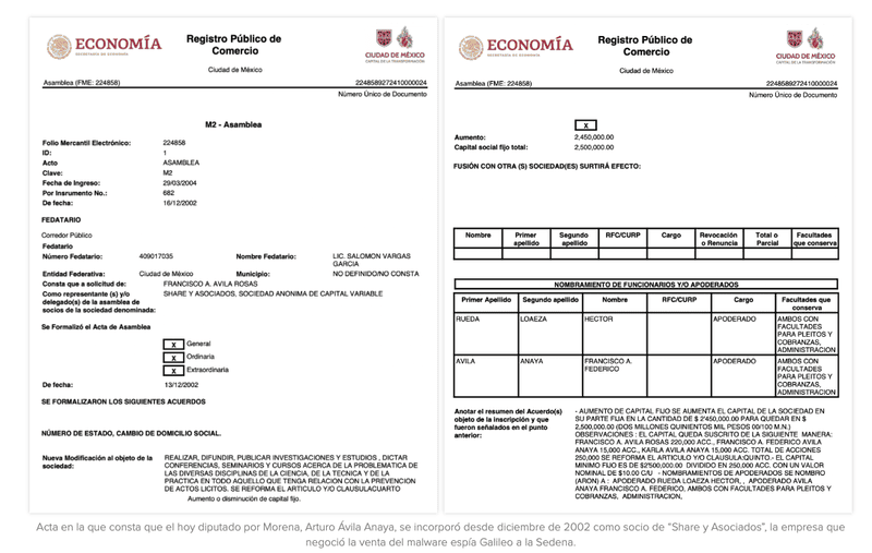 La empresa fue creada el 17 de junio de 1997, y Ávila Anaya se incorporó como socio en una asamblea realizada el 13 de diciembre de 2002, según quedó asentado en un acta formalizada ante el notario Salomón Vargas García e inscrita en el Registro Público de Comercio de la Ciudad de México. Ese día, se acordó el aumento de capital de “Share y Asociados” para integrar como socio a Arturo Ávila Anaya, quien además fue nombrado apoderado de la empresa.