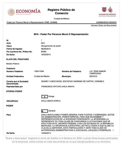 En 2014, cuando se empezó a negociar la venta de Galileo a la Sedena, Ávila Anaya seguía participando en la empresa, según consta en documentos notariales. Por ejemplo, el 19 de mayo de ese año otorgó a su hermana Karla un poder general para pleitos, cobranzas y actos de administración, además de darle facultades para representar a la empresa en contratos y licitaciones públicas.
