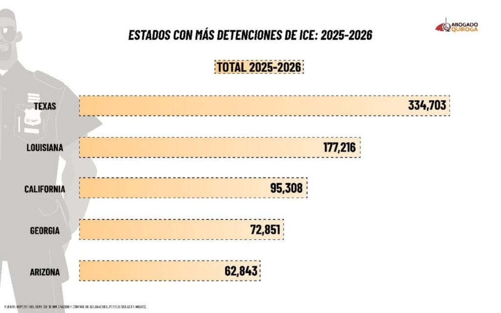 A nivel nacional, además, las cifras muestran una fuerte concentración geográfica del sistema de detención migratoriaTexas lidera ampliamente con 334,703 arrestos, seguido por Luisiana con 177,216. Juntos concentran cerca del 44 % de todas las detenciones migratorias registradas en Estados Unidos entre el año fiscal 2025 y lo corrido del año fiscal 2026, una distribución que coincide con la presencia de grandes centros de detención y con la cercanía de estos estados a la frontera sur.