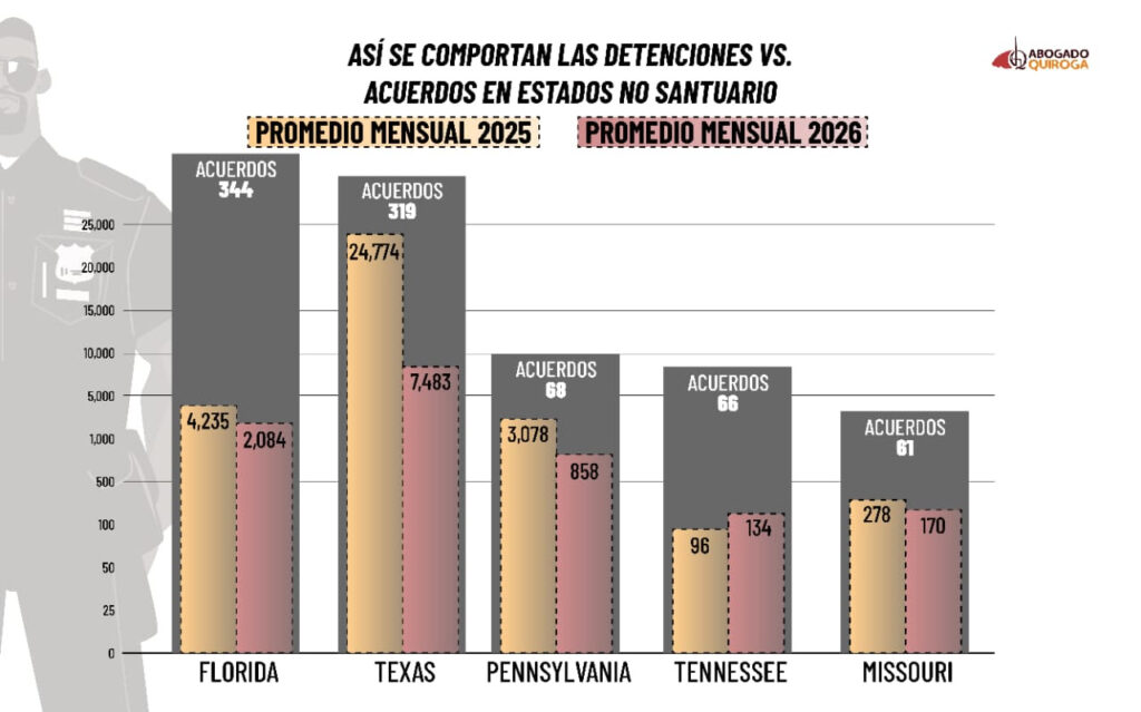 “Cuando se analizan las cifras con más detalle, se observa que el número de acuerdos 287(g) no siempre guarda una relación directa con el volumen de detenciones. Incluso en estados con una cooperación muy alta con ICE, el promedio mensual de arrestos puede disminuir de un año a otro. Esto sugiere que factores como la infraestructura de detención, la ubicación geográfica o la intensidad de las operaciones federales pueden tener un peso importante en cómo se distribuyen las detenciones en el país”, explica el abogado de inmigración Héctor Quiroga, de de Quiroga Law Office, PLLC.
