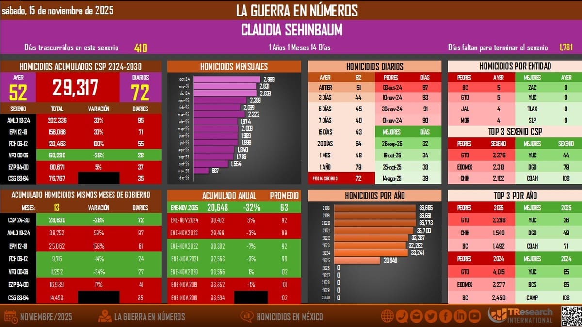 México atraviesa uno de los periodos más violentos de su historia reciente, pero las cifras oficiales del delito de homicidio muestran una dinámica de aparente contención. De acuerdo con datos de TResearch International, actualizados hasta el 15 de noviembre de 2025, el sexenio en curso acumula 29,317 víctimas de homicidio, manteniendo un promedio diario de 72 casos. El dato más relevante en el actual panorama de seguridad es el que compara el acumulado de enero a noviembre de 2025 (20,648 víctimas) con el mismo periodo de 2024 (30,402), mostrando una reducción del 32%.