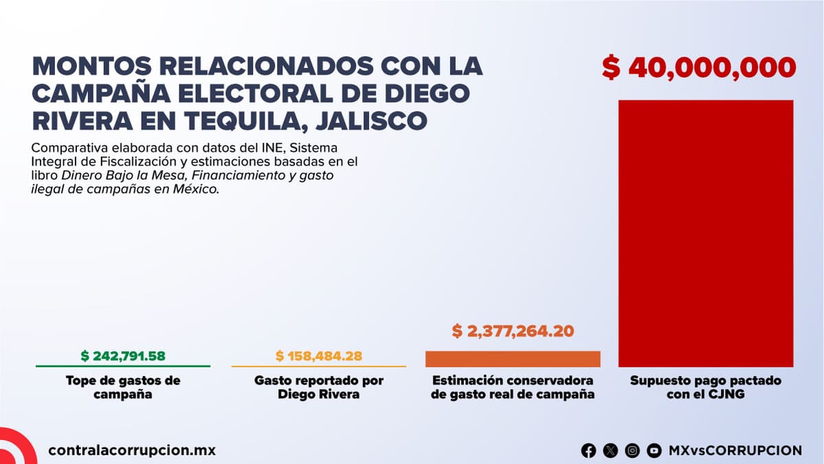 De acuerdo con la información oficial del Instituto Nacional Electoral (INE), la campaña de Diego Rivera en 2024 para la presidencia municipal de Tequila, Jalisco, tuvo un costo total de 158 mil 484 pesos. Este gasto fue incluso austero: de los 242 mil pesos que era posible gastar en ese municipio, Diego Rivera reportó haberse limitado a usar solo 65% del tope de gastos de campaña. ¿Son creíbles estas cifras? De ninguna manera.