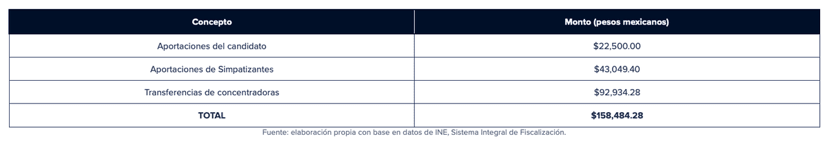 En el reporte de contabilidad de la campaña de Diego Rivera, sus ingresos declarados provienen únicamente de tres fuentes: 22 mil pesos que el candidato puso de su propia bolsa, 92 mil que vinieron de las cuentas concentradoras de los partidos de la coalición y 43 mil pesos más de aportaciones de personas físicas.