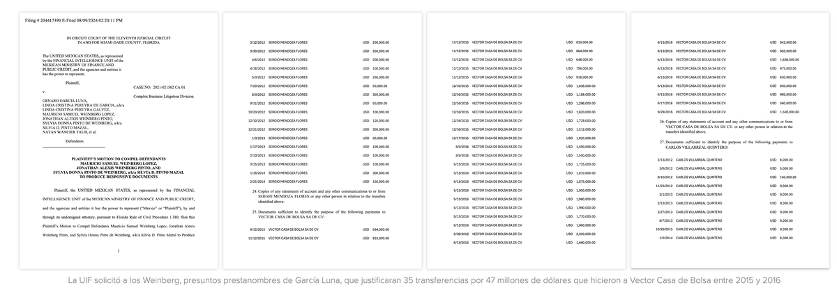 Los requerimientos sobre la información bancaria de Vector comenzaron el 12 de junio de 2024, cuando a solicitud del despacho de abogados que representaba a la UIF, la jueza del caso, Lisa Walsh, envió una carta rogatoria a la Comisión Nacional Bancaria y de Valores (CNBV) para que solicitara a Citibanamex información sobre las operaciones realizadas por la cuenta 36885306 de Vector Casa de Bolsa.