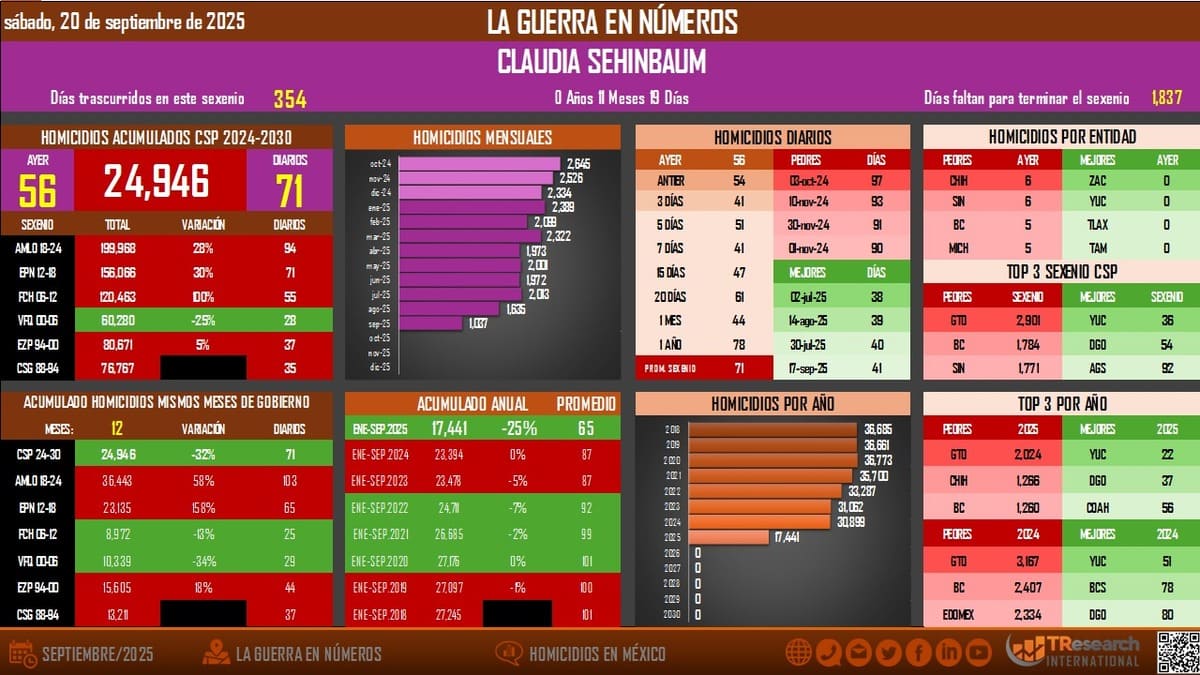 México vive una crisis de violencia sin precedentes. Según datos actualizados al 20 de septiembre de 2025, el país registró 56 homicidios dolosos en un solo día —un promedio de uno cada 26 minutos—, según el Secretariado Ejecutivo del Sistema Nacional de Seguridad Pública. Esta cifra, aunque ligeramente menor que los 97 homicidios del 3 de octubre de 2024 (el peor día del sexenio), refleja una tendencia alarmante: la violencia se ha convertido en un fenómeno cotidiano, no excepcional.