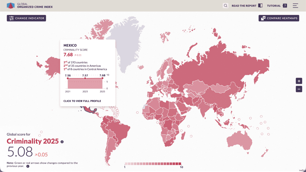 El panorama del crimen organizado en México atraviesa un punto de inflexión crítico, caracterizado por una sofisticación sin precedentes en sus mercados criminales y una presión constante sobre las estructuras de resiliencia del Estado. Según los datos del Índice Global de Crimen Organizado 2025, México se mantiene como uno de los entornos más complejos y afectados por la criminalidad transnacional a nivel mundial, con una puntuación promedio en sus mercados criminales de 8.27, lo que representa un incremento de +0.14 respecto a la medición anterior.