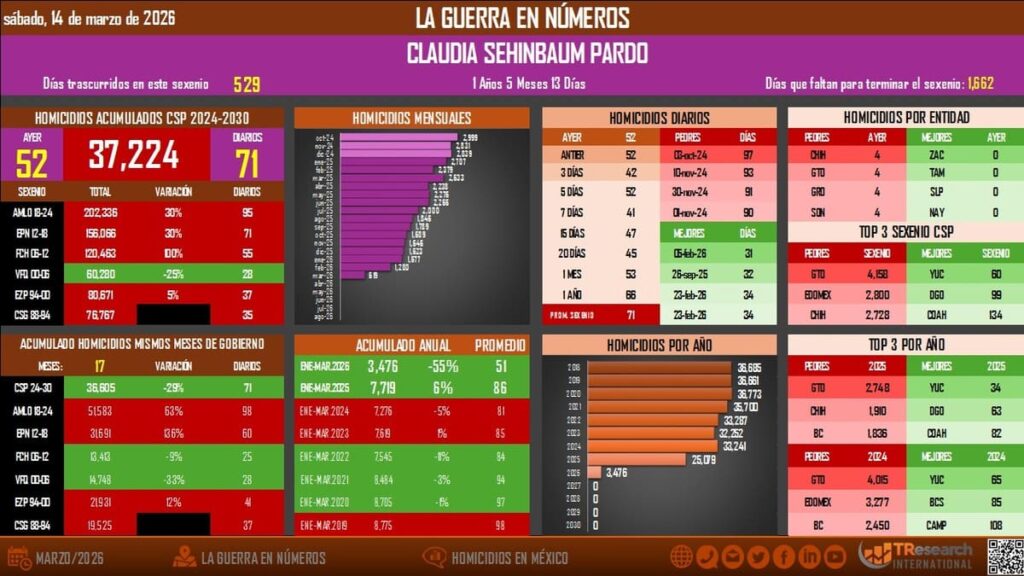 En los primeros 529 días del gobierno de Claudia Sheinbaum Pardo, México ha acumulado un total de 37,224 homicidios dolosos. Esta cifra, que forma parte del reporte «La Guerra en Números» de TResearch con corte al 14 de marzo de 2026, revela que, aunque la violencia persiste como un desafío central, existe una tendencia a la baja en comparación con el arranque del sexenio anterior. Mientras que en el periodo equivalente de la administración de López Obrador se promediaban 95 asesinatos diarios, la gestión actual registra una media de 71 casos cada 24 horas.