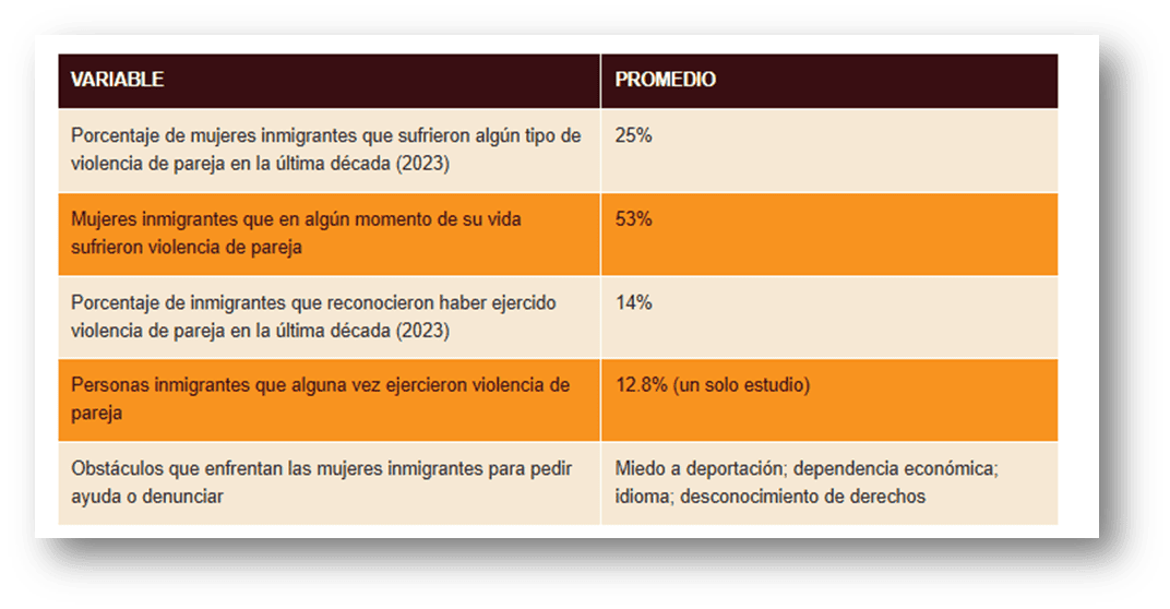 Los estudios revisados por la Librería Nacional de Medicina ratifican esta tendencia: una de cada cuatro mujeres inmigrantes ha sufrido violencia de pareja y más de la mitad (53 %) la ha vivido en algún momento de su vida. Las barreras están en el temor a la deportación, la dependencia económica del agresor y las limitaciones lingüísticas o culturales.