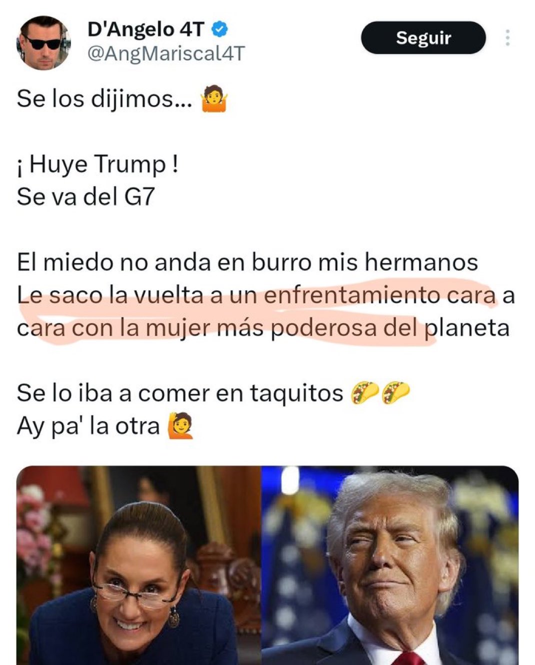 ¡Agárrense, chairos y fifís! La neta, la conspiración guinda no tiene límites. ¿Trump huyendo del G7 por miedo a nuestra flamante presidenta, la mismísima Claudia Sheinbaum? ¡No manches! O sea, el güero que se echa pleitos con medio mundo, ¿le sacó a la “Doctora” por aquello de que no le fuera a aplicar una encuesta rápida en el pasillo o qué onda? ¡Ya ni en las caricaturas!