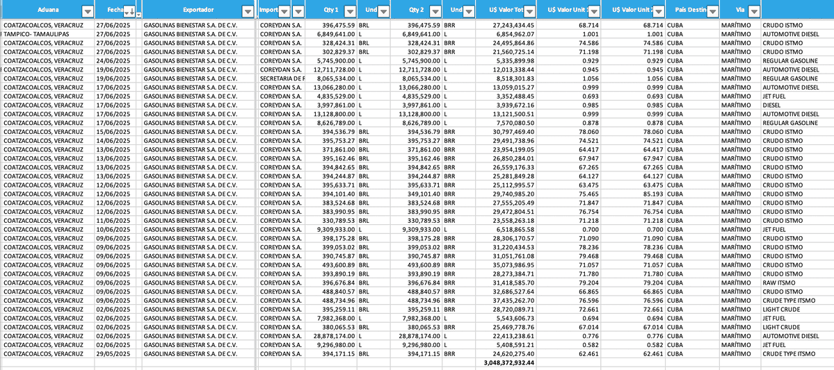 Ambas herramientas reportan hasta septiembre cifras idénticas: un total de 60 envíos por parte de Gasolinas Bienestar a Cuba, con la empresa estatal cubana Coreydan como importadora, y con un valor de cargamentos que supera los 3 mil 048 millones de dólares.