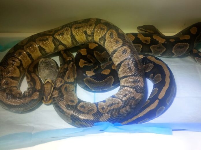La pitón reticulada (Malayopython reticulatus) padece estomatitis, es decir, inflamación de su boca, pulmonía y una lesión en la punta de la cola. Una de los ejemplares de pitón bola (Python regius) tiene retención de muda, bajo peso y pulmonía. Estos tres ejemplares están respondiendo favorablemente a los tratamientos, pero aún corren riesgo de que se deteriore su salud por las condiciones en que llegaron y la forma en que eran manipulados.
