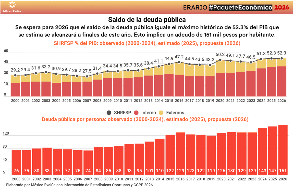 Lejos de disminuir, estamos ante un endeudamiento en rápido crecimiento: entre el cierre de 2024 y del próximo, 2026, la deuda por persona habrá aumentado 5.1% en términos reales, equivalente a 7 mil pesos adicionales por habitante en sólo dos años. Así, cada ciudadano cargaría con una deuda de 151 mil pesos.