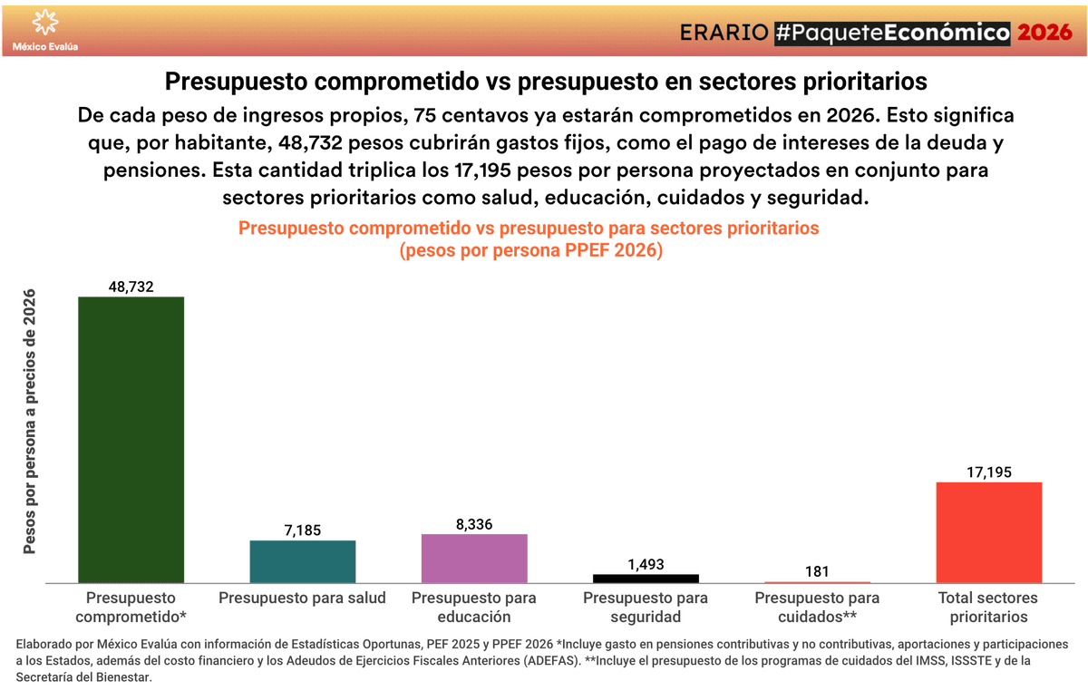El Paquete Económico 2026 contempla la mayor proporción de gastos obligatorios dentro del presupuesto federal desde 1995. En términos per cápita: 48,732 pesos por habitante se destinarán a cubrir compromisos fijos, como el pago de pensiones y de intereses de la deuda. Esta cifra triplica los 17,195 pesos por persona que, en conjunto, se asignarán a salud, educación, cuidados y seguridad.