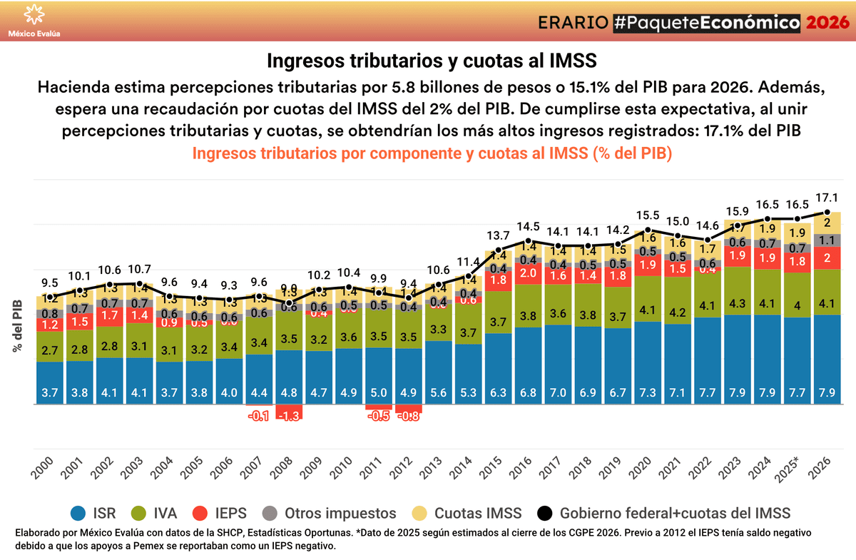Se esperan ingresos tributarios por 5.8 billones de pesos, un crecimiento de 6.5% o 358 mil millones de pesos (mmdp) frente a 2025. Así, cada persona pagará, en promedio, 43,439 pesos en impuestos, 4.9% (2,023 pesos) más que en 2025. De cumplirse este estimado, el cobro de impuestos llegaría a un máximo histórico de 15.1% del PIB para 2026.