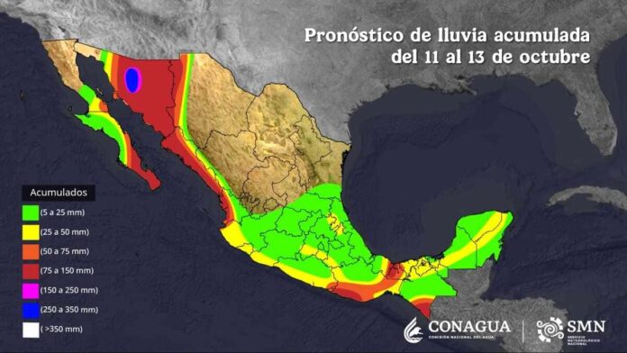 Los remanentes del ciclón interaccionarán con el frente frío número 6, por lo que se pronostican lluvias intensas (de 75 a 150 milímetros [mm]) para este sábado y lluvias torrenciales (de 150 a 250 mm) durante el domingo, en regiones de Sonora, así como vientos fuertes (desde 40 hasta 70 kilómetros por hora [km/h]), durante el fin de semana. Para el lunes, se prevén lluvias puntuales fuertes (de 25 a 50 mm) y rachas de viento de 50 a 70 km/h, en la misma entidad.