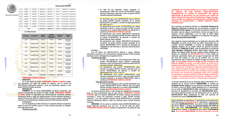 El expediente, al que Mexicanos Contra la Corrupción y la Impunidad (MCCI) tuvo acceso, detalla que, tan solo en 2025, Fernando Farías Laguna recibió 41 depósitos que suman más de 40.3 millones de pesos en sus cuentas personales, entre las que destaca una operación de 5 millones de pesos que Farías Laguna recibió de la empresa Agroexportadora SE.