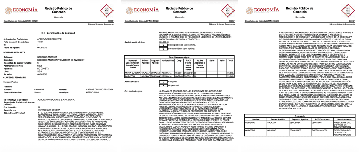 Aunque la causa penal no menciona quiénes son los accionistas o representantes de Agronegocio SE y Agroexportadora SE, MCCI pudo comprobar, mediante una búsqueda en registros mercantiles, que detrás de ellas se encuentra Gilberto Salazar Escoboza, quien preside el Consejo de Administración en ambas empresas. Mientras que sus hijos, María Eugenia y Gilberto Salazar Escalante, son los accionistas de las dos compañías.