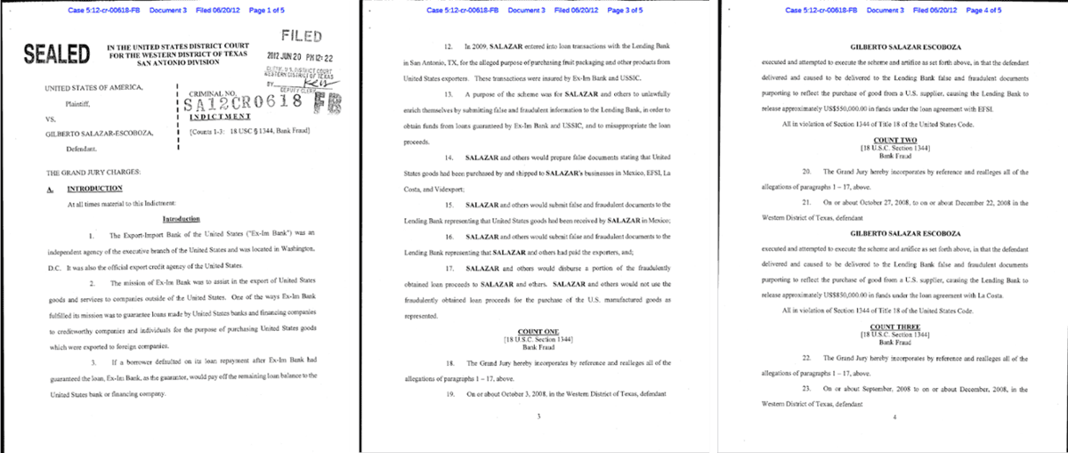 La acusación, presentada por la Oficina del Fiscal Federal del Distrito Oeste de Texas, señala que, entre 2008 y 2009, Salazar Escoboza presentó documentos y cheques falsos afirmando que sus empresas habían comprado y recibido mercancía de la compañía estadounidense Cal-Pine, cuando en realidad dichas operaciones comerciales nunca se realizaron.