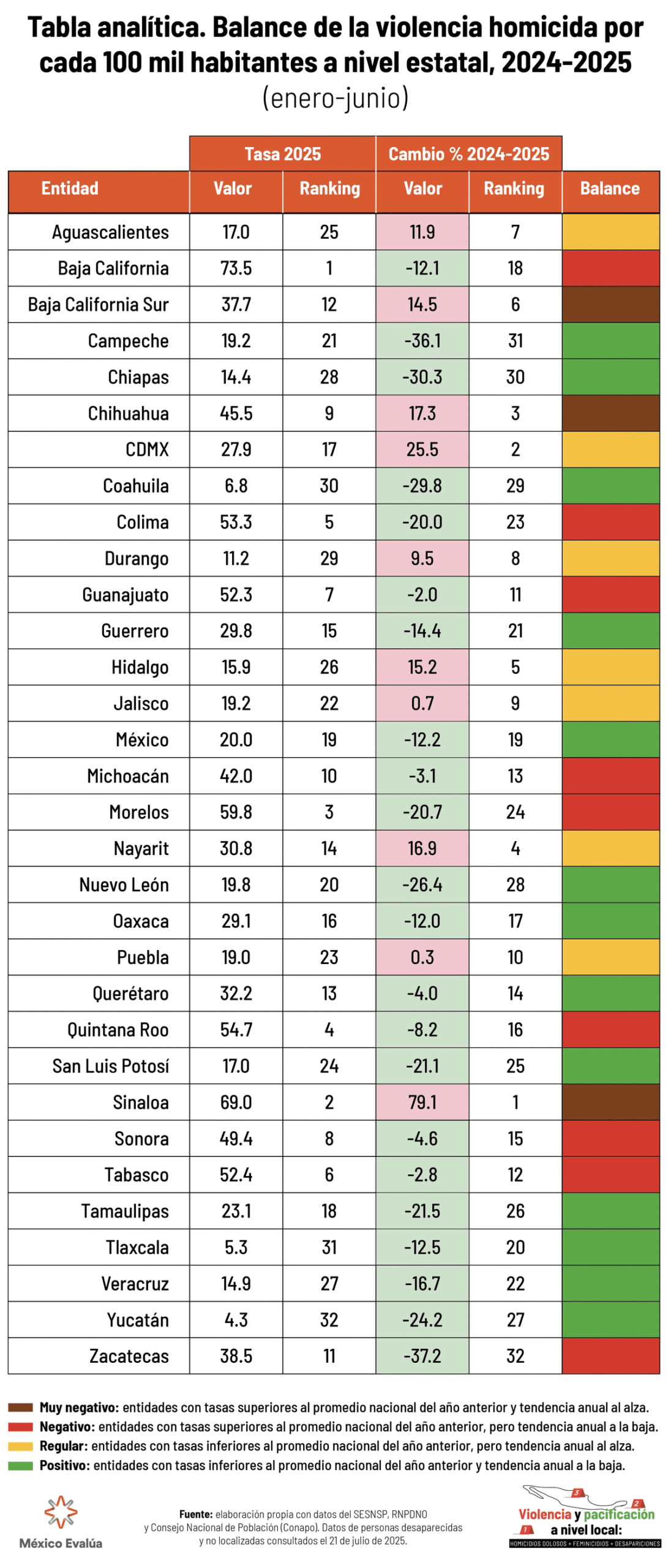 Sólo un tercio del país —13 entidades— presenta un balance positivo: Campeche, Chiapas, Coahuila, Guerrero, Estado de México, Nuevo León, Oaxaca, Querétaro, San Luis Potosí, Tamaulipas, Tlaxcala, Veracruz y Yucatán. Es la segunda ocasión que Zacatecas y Jalisco no figuran en esta lista; lo que genera preguntas sobre sus capacidades institucionales para capturar las diferentes expresiones de la violencia letal y sus incentivos políticos para subreportar estos fenómenos, pese a que su origen partidista es distinto.
