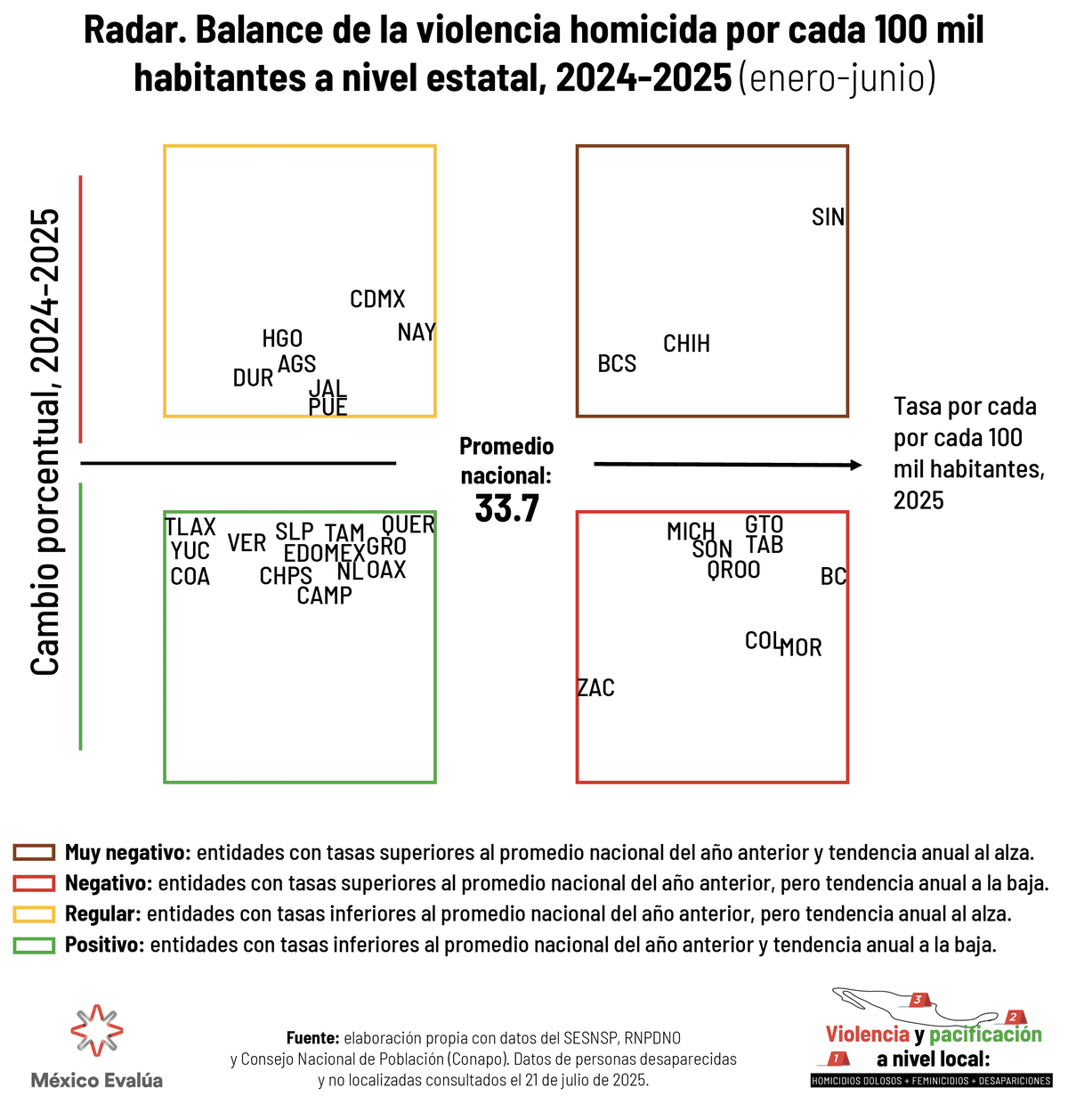 ¿Cómo leer el radar? El eje horizontal traza la tasa del año en curso por cada 100 mil habitantes. La tasa es más alta cuando supera el promedio nacional del año anterior. El eje vertical muestra el cambio porcentual con respecto a ese año. De este modo, ubicamos cuatro conjuntos sobre la situación de la violencia homicida en los estados: positiva, regular, negativa o muy negativa. Cada conjunto cuenta con sus propias escalas de variación a partir de los puntos de corte establecidos. El radar permite detectar cuándo un estado está a punto de cambiar de situación, ayudando a identificar focos rojos.