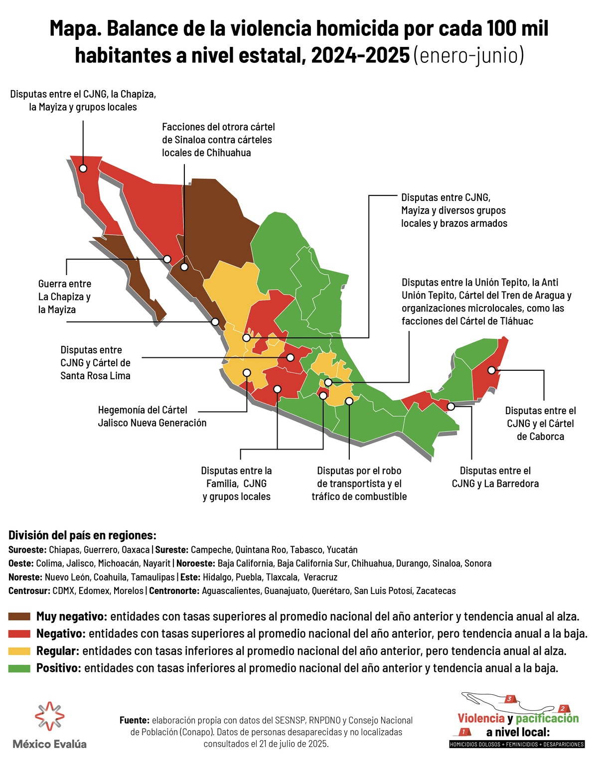 El mapa revela una configuración territorial del crimen organizado caracterizada por altos niveles de violencia concentrados en tres grandes regiones del país: el noroeste, el centro-occidente y el sur-sureste. En la región noroeste, que abarca entidades como Baja California, Sonora y Chihuahua, predominan los colores rojo (balance negativo) y café (balance muy negativo), lo que indica una intensa conflictividad derivada de la fragmentación del extinto Cártel de Sinaloa. Las disputas entre facciones como La Chapiza y Los Mayos, así como los enfrentamientos con grupos locales en Chihuahua, generan un entorno de violencia estructural que se agrava por la ubicación estratégica de esta zona como corredor fronterizo para el tráfico de drogas, armas y personas.