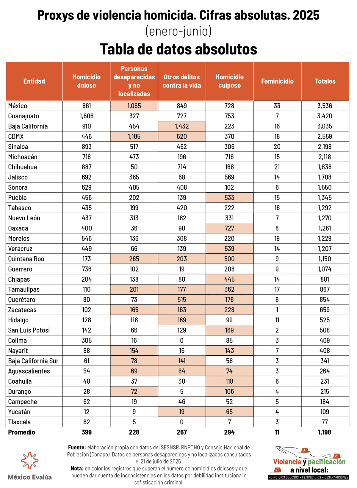 El tamaño de la violencia en 2025 (cifras totales enero-junio) tasa por cada 100 mil habitantes