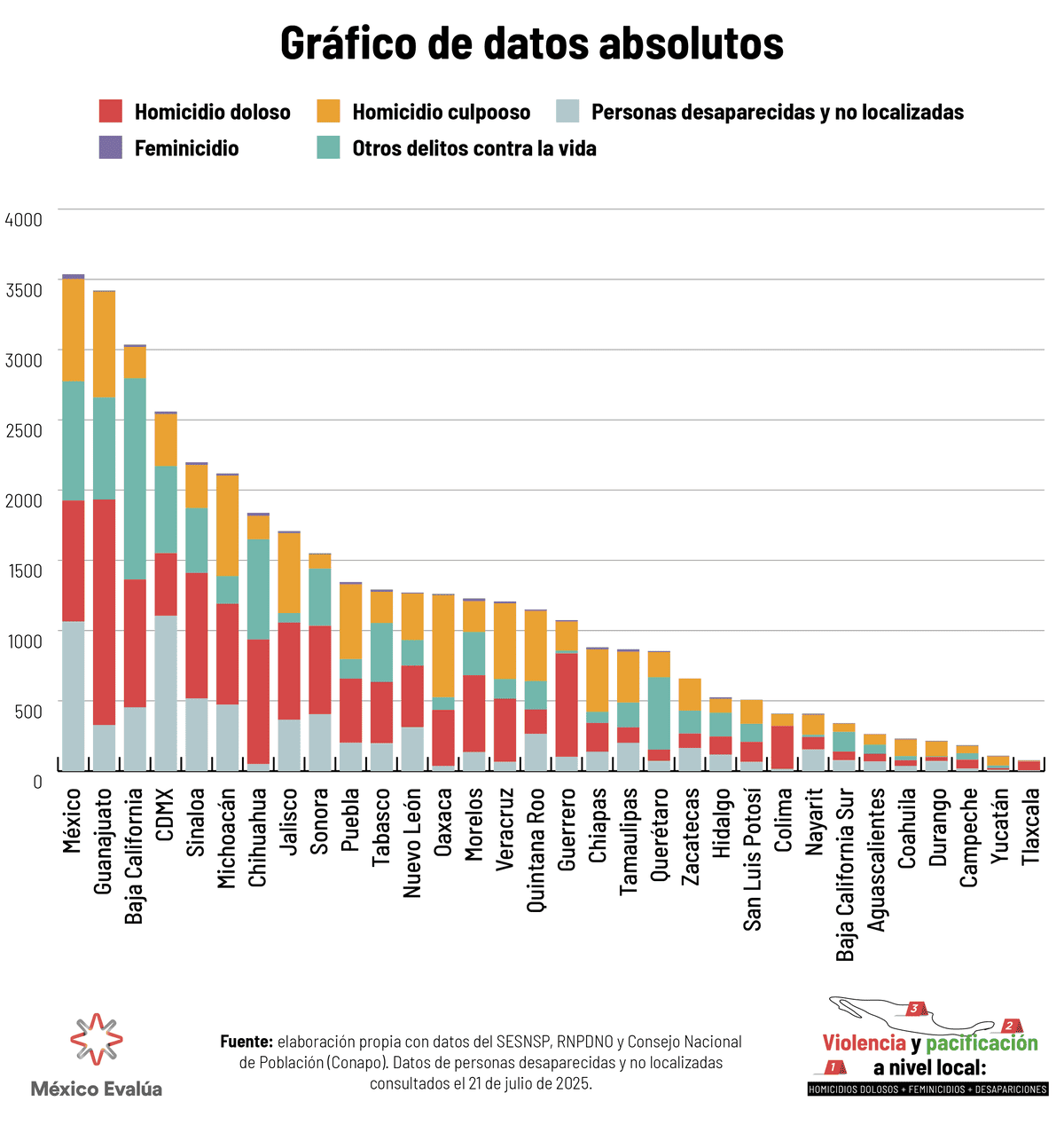 Este reporte considera los siguientes proxys de violencia homicida: homicidio doloso; homicidio culposo; feminicidio; otros delitos contra la vida y la integridad corporal; y personas desaparecidas y no localizadas. Es decir, se incorporan homicidios culposos y otros delitos contra la vida corporal. Lo anterior, ante la evidencia que sugiere que el incremento de estos fenómenos refleja, de manera respectiva, inconsistencias en el registro de cadáveres o mecanismos de exterminio del crimen organizado. Considerar esta información en su conjunto es útil para identificar patrones con mejor precisión, así como formular preguntas sobre las causas del incremento o reducción de la violencia homicida y llamar a la rendición de cuentas.